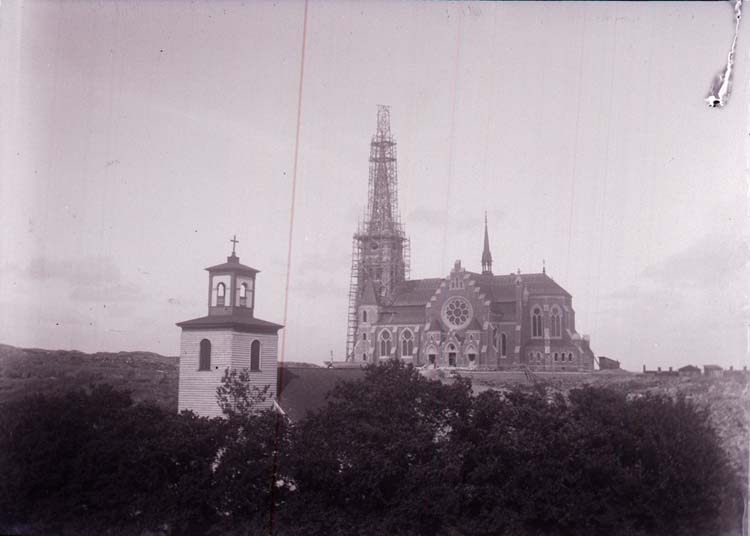 Enligt text som medföljde bilden: "Nya o Gamla kyrka fr. berget vid L.A Carlssons 12/6 1901".