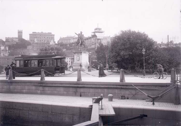 Enligt text som medföljde bilden: "Karl XIV Johans staty o. Katarinahissen 2/9 1900."