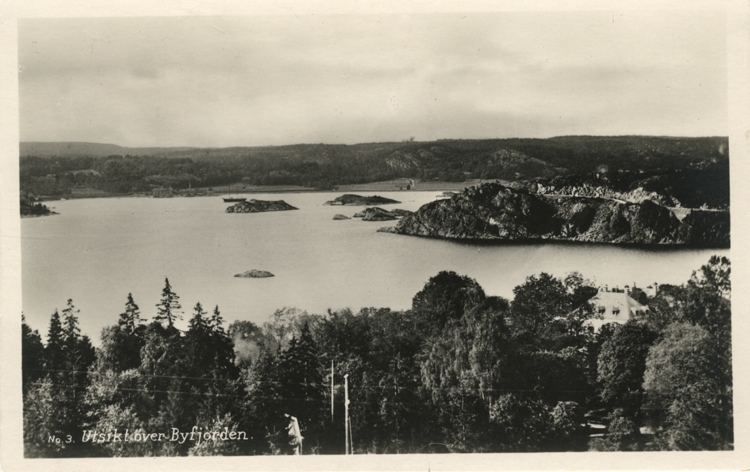 Tryckt text på vykortets framsida: "Utsikt över Byfjorden."