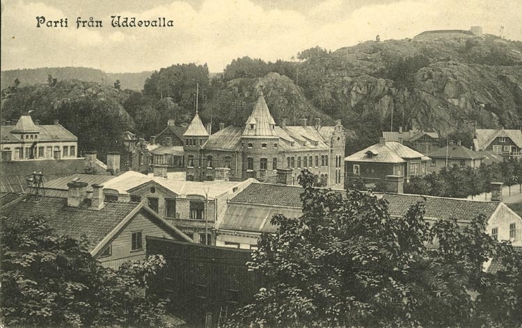 Tryckt text på vykortets framsida: "Parti från Uddevalla."