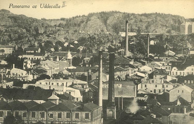 Tryckt text på vykortets framsida: "Panorama av Uddevalla."