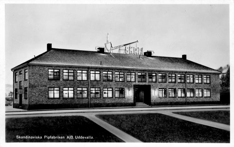Tryckt text på vykortets framsida: "Skandinaviska Pipfabriken A/B Uddevalla."