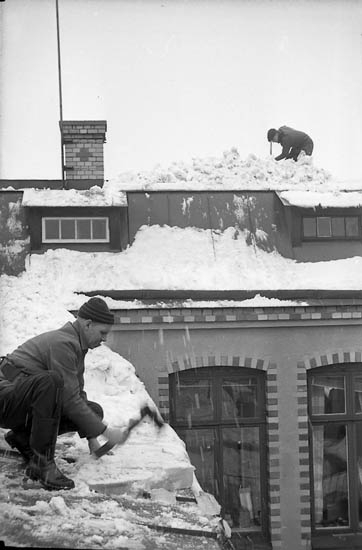 Enligt fotografens notering: "Snöskottare på tak 1966".