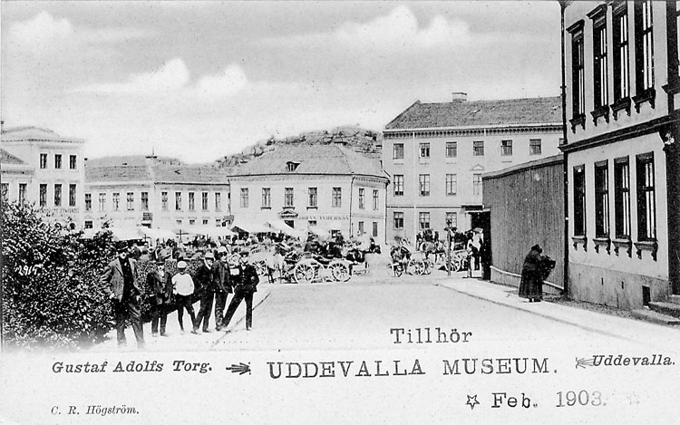 Tryckt text på vykortets framsida: "Gustaf Adolfs Torg Uddevalla".