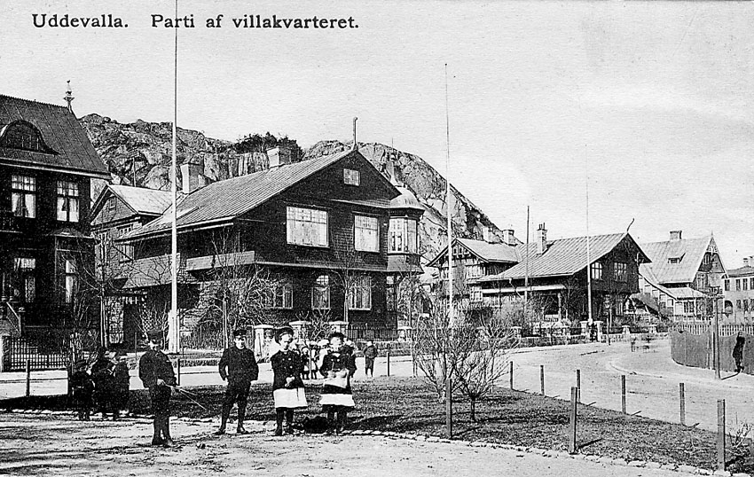 Tryckt text på vykortets framsida: "Parti af villakvarteret. Uddevalla".