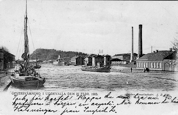 Tryckt text på vykortets framsida: "Översvämning i Uddevalla den 22 febr. 1903".