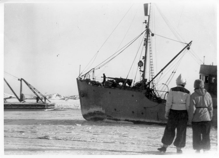 Enligt fotografens notering: "Skagerack med kanon på fördäck bryter is 1940".