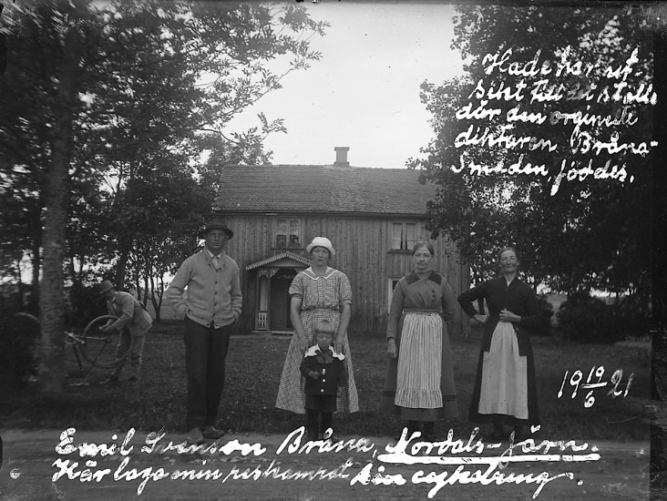 Enligt text på fotot: "Hade här utsikt till det ställe där den orginelle diktaren Bråna-Smeden föddes. Emil Svenson Bråna, Nordals-Järna. Här laga min reskamrat sin cykelslang".