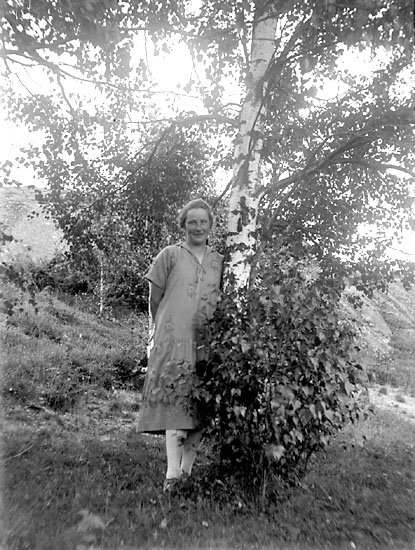 Enligt notering: "Kvinna vid björk, Amanda Karlsson, Åbrott".