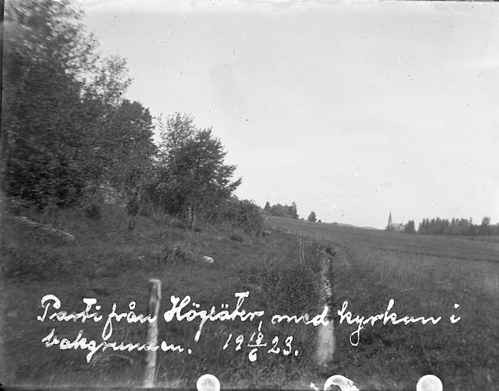 Enligt text på fotot: "Parti från Högsäter med kyrkan i bakgrunden. 18/6 1923".