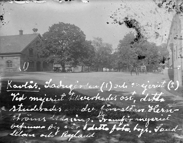 Enligt text på fotot: "Kavlås. Ladugården (1) och mejeriet (2). Vid mejeriet tillverkades ost, detta studerades under förvaltare Hernströms ledning. Framför mejeriet befunno sig när detta foto togs, Sandblom och Ryland".