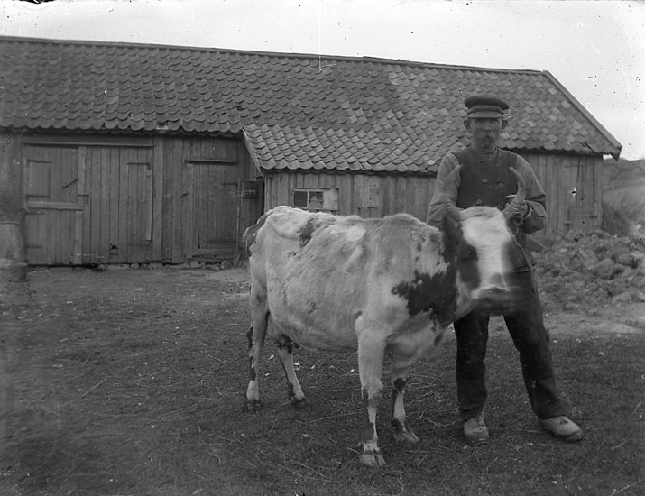 Enligt notering: "Gårdsbild: Bonden och kon. Hurtig, Ersmyrarna torp under Hjälpesten".