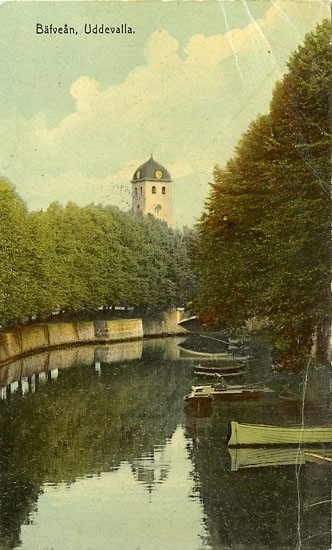 Tryckt text på vykortets framsida: "Bäfveån Uddevalla".