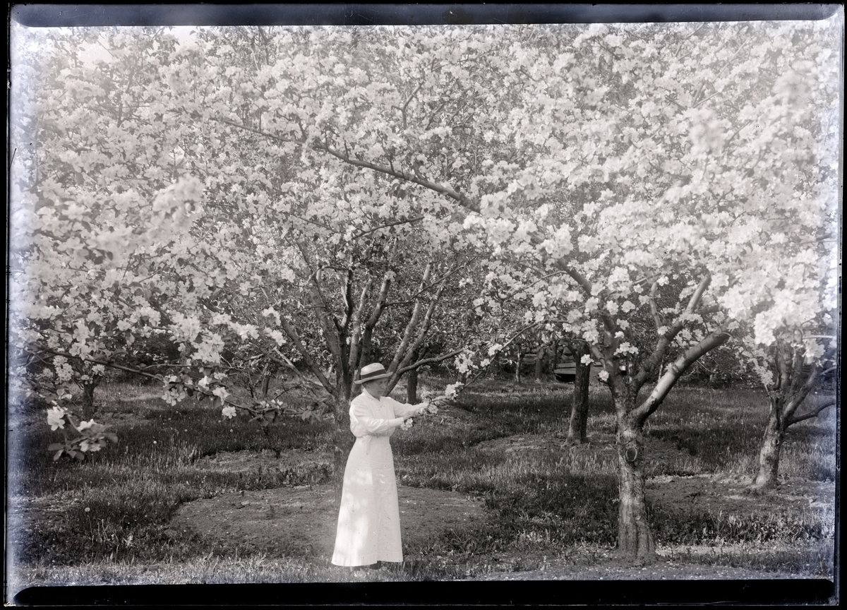Blommande fruktträd i ett system så alla träd skulle få maximalt med solljus.