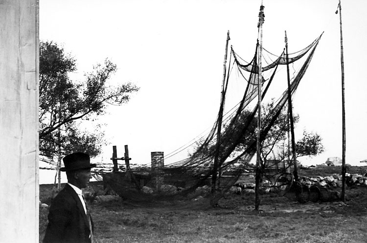 Skrivet på baksidan: Blekinge, Listers hd, Mjällby sn, Hörvik. Ett nytjärat bottengarn torkas.