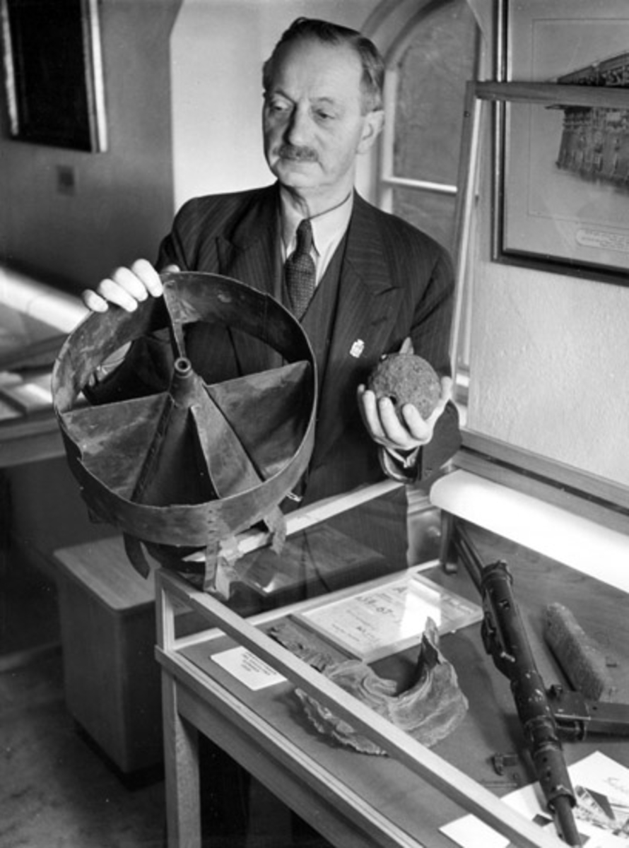 Skrivet på baksidan: Krigsminder: Bombehale fra Engländernes Luftangreb januar 1943 og kugle fra Engländernes bombardement 1807. I montren: bl.a. eksemplar af illegalt framstellet maskinpistol.