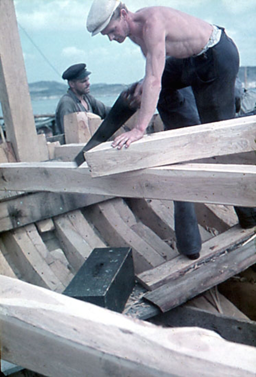 Bergs varv, Hälsö. Nybygge av fiskebåt på Bergs varv. t.v. Oskar Karlson, t.h. Walter Berg.