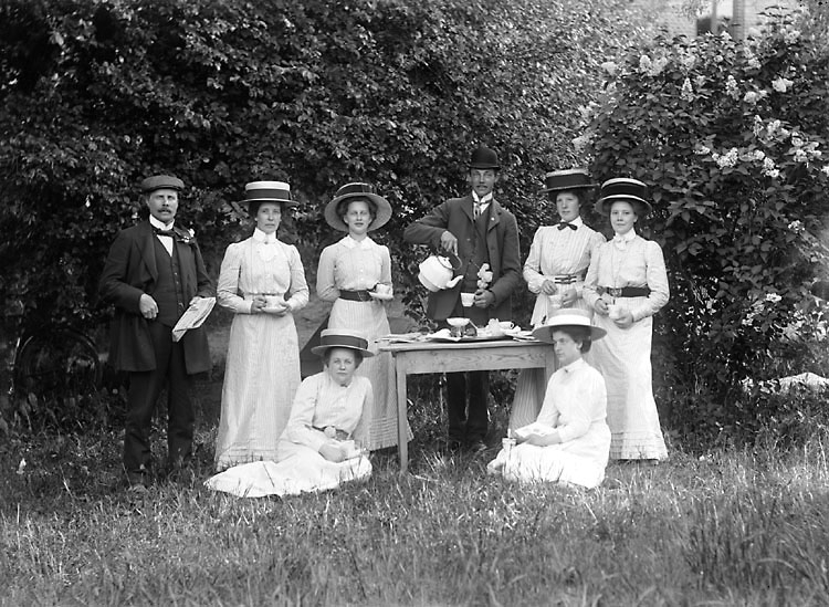 Enligt noteringar: "Runt ett kaffebord utanför slottsbyggnaden, som skymtar mellan buskarna." (BJ)