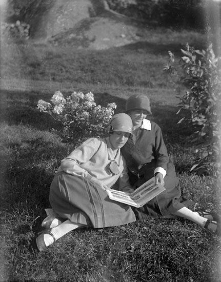 Enligt senare noteringar: "Tekla Börjesson-Eld och Elsa Teng i trädgården, med fotoalbum".