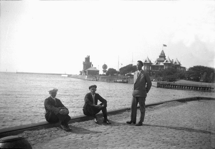 Enligt senare noteringar: "Tre män stående på en kaj. Från vänster: Viborg Johansson, Ed, Hjalmar Jonasson, Kleva och Gunnar Bjelkert, Hallinden".