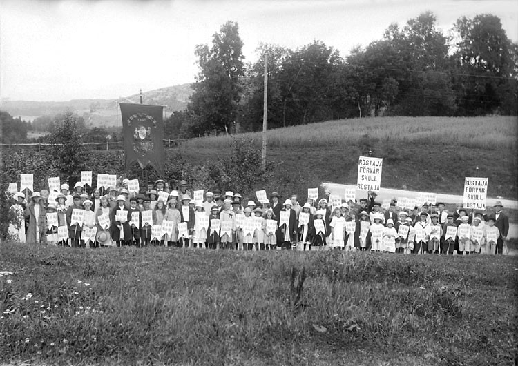 Enligt senare noteringar: "IOGT-logen Munkedal, i demonstrationståg utanför Oscar Färdigs fastighet. Det är troligen förbudsomröstningen 1922, som är föremålet för tåget.