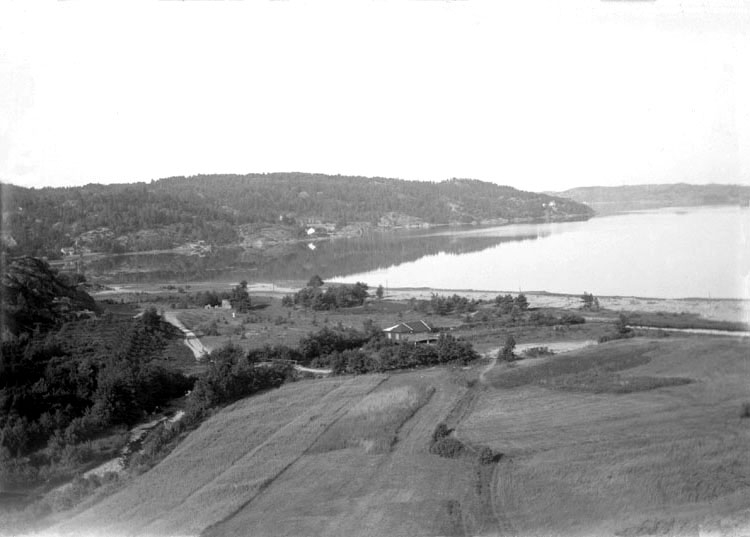 Enligt senare noteringar: "Vy över det inre av Saltkällefjorden. Bilden visar Taskeåns utlopp i fjorden, på klippan rakt över fjorden står torkställning för fiskenät.