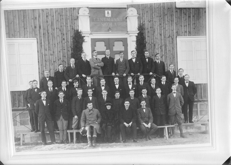 Enligt noteringar: "Elevgrupp på Dingle lantmannaskola. Tredje man från vänster på första bänk är rektorn Ernst E:son Ernest." (BJ)