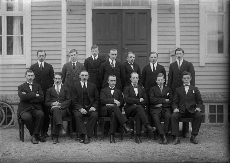 Enligt noteringar: "21 april 1924. Skolklass Nordbergska stiftelsens slöjdskola. På bänken sitter nr. 3, 4 och 5 lärarna Ivar Kjerrström, Algot Carlsson och Henning Hasselgren." (BJ)