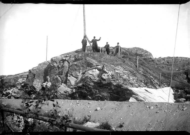 Enligt noteringar: "De fyra männen på berget är troligen knutna till järnvägen. Den tredje ser ut att ha uniform. Platsen är till synes någonstans på den nybyggda Lysekilsbanan."