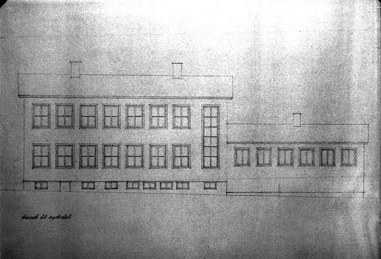 Enligt noteringar: "Avfotograferad skiss på skolbyggnad, troligen tänkt nybyggnad vid Munkedals Centralskola." (BJ)