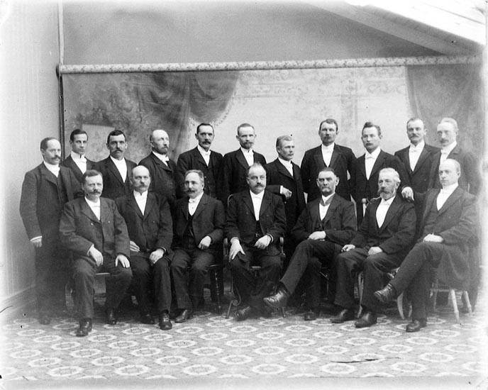 Enligt tidigare noteringar: "Ateljéfoto av 18 st. högtidsklädda män. Loge Knape."