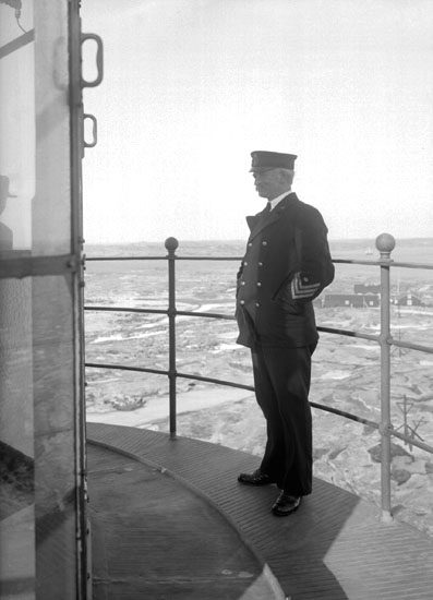 Mars 1924. Fyrmästaren Uhrberg stående på lanterninbryggan på Hållö fyr.