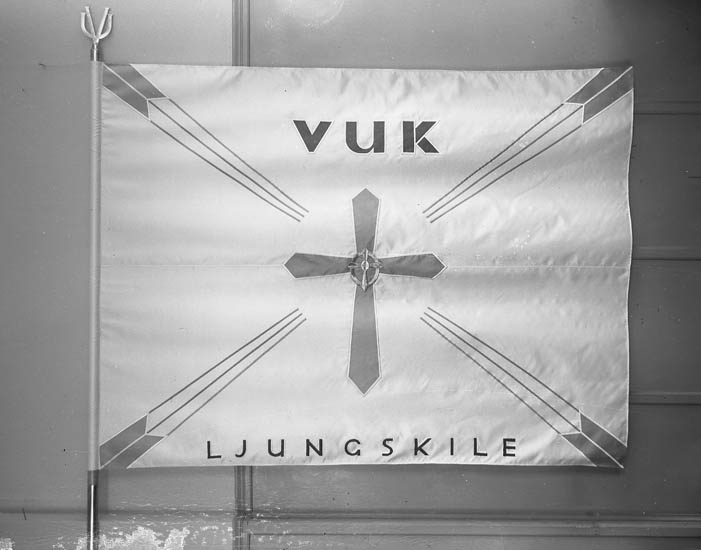 Text till bilden:"Fana med förkortning V.U.k. Ljungskile. Västkustens Ungdomsskolans kamratförbund".