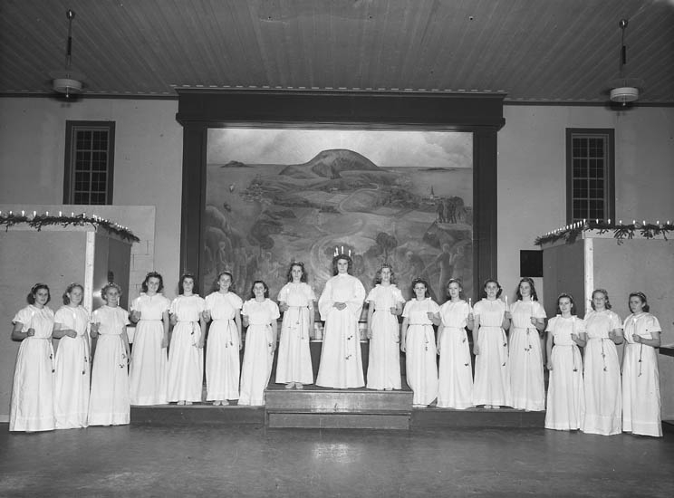 "Lucia med tärnor i samlingssalen, alla har ljus i händerna", 1949