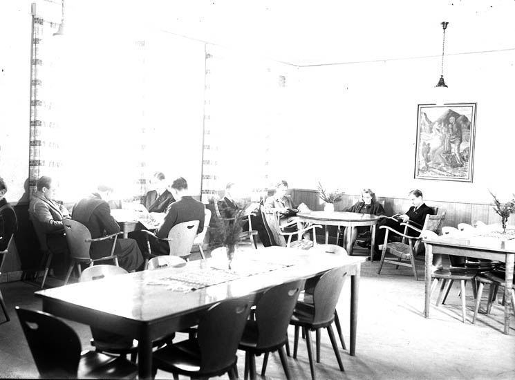 Text till bilden:"Gamla Samlingsalen. Västkustsalen.Bord, stolar, fåtöljer. Tavla på väggen".