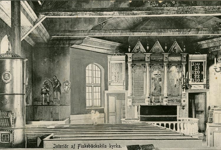 Notering på kortet: Interiör af Fiskebäckskils kyrka.