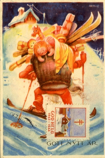 Kort: "Gott Nytt År". Tomte med kont full av klappar på väg upp till en stuga.