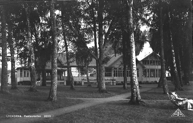 Enligt Bengt Lundins noteringar: "Lyckorna. Badrestauranten bakom träd. Vykort YF 2033 BL 383".