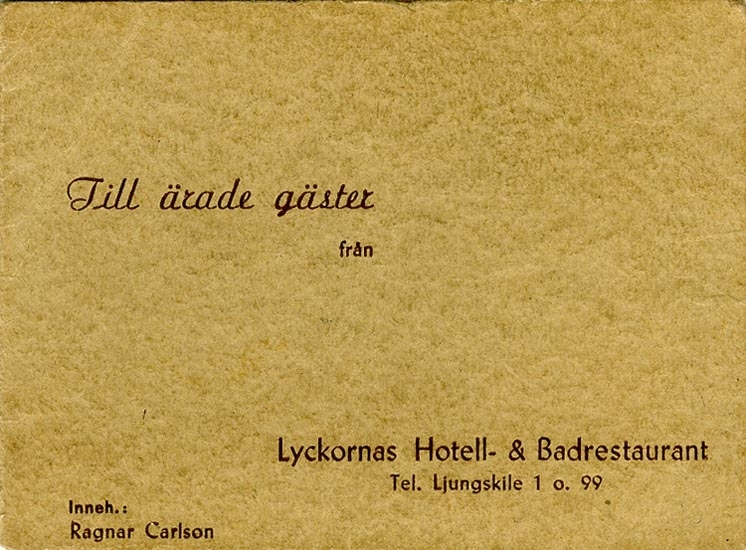 Enligt Bengt Lundins noteringar: "Omslag till restaurangnota. Till ärade gäster från Lyckornas Hotell & Badrestaurant".