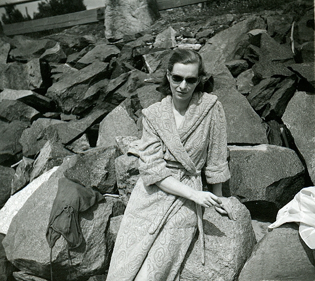 Gunnel Madgård f. Abrahamsson f.1919 vid "vår" badstrand (servitut). Badrocken blå, sommaren 1956.