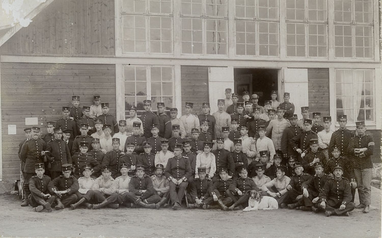 Enligt Bengt Lundins noteringar: "Grupp framför en lägerhyddas gavel".