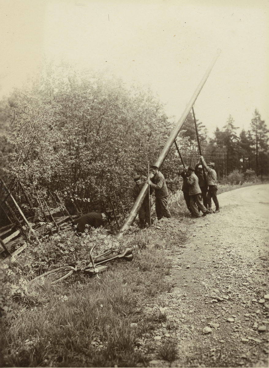 Hjälmsätrakabeln. Stolpresning. Ur albumet Kabelarbetet Hjälmsälra (Hjälmsättra) - Norrtälje - Finnviken utfört under sommaren 1928.