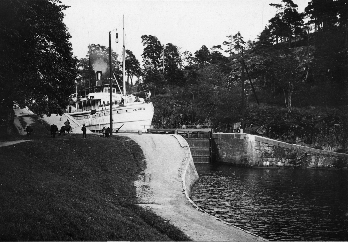 Göta Kanal. Ångbåten Venus vid Carlsborgs slussar.