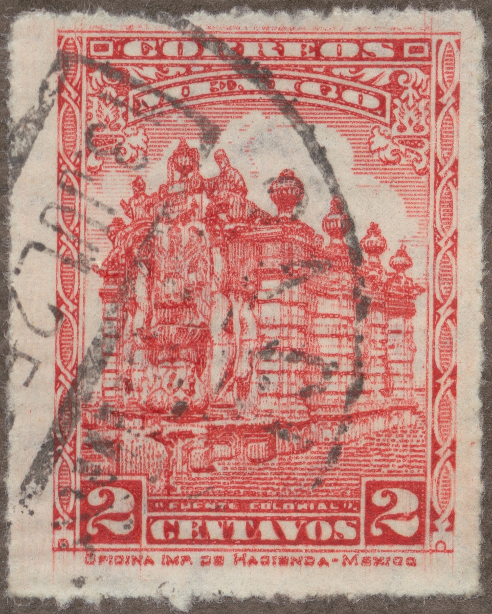 Frimärke från Mexico, 1921. Motiv av brunnhus för saltvatten. "El Salto de Aqua".