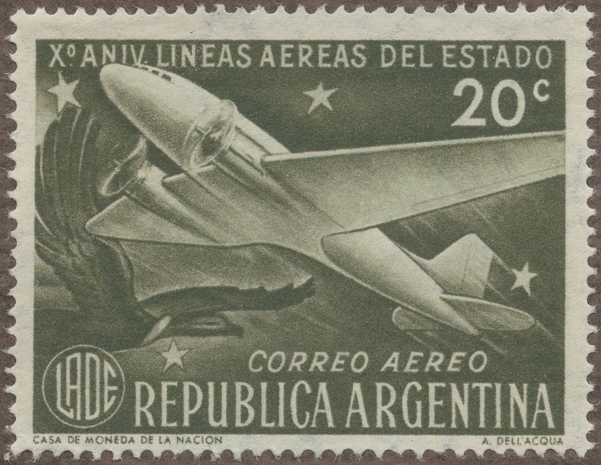 Frimärke från Argentina, 1950. Motiv av Tvåmotorigt monoplan och flygande gam "-10-årsminne av Statens flyglinjer 1940-1950."
