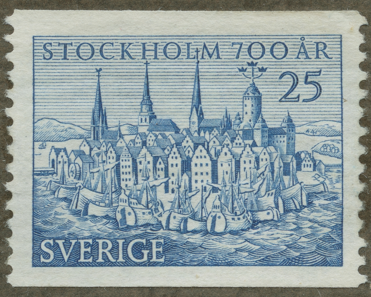 Frimärke från Sverige, 1953. Motiv av Symbolisk bild över "Gamla Stan" mellan broarna. -Stockholm 700 år. 1253-1953.