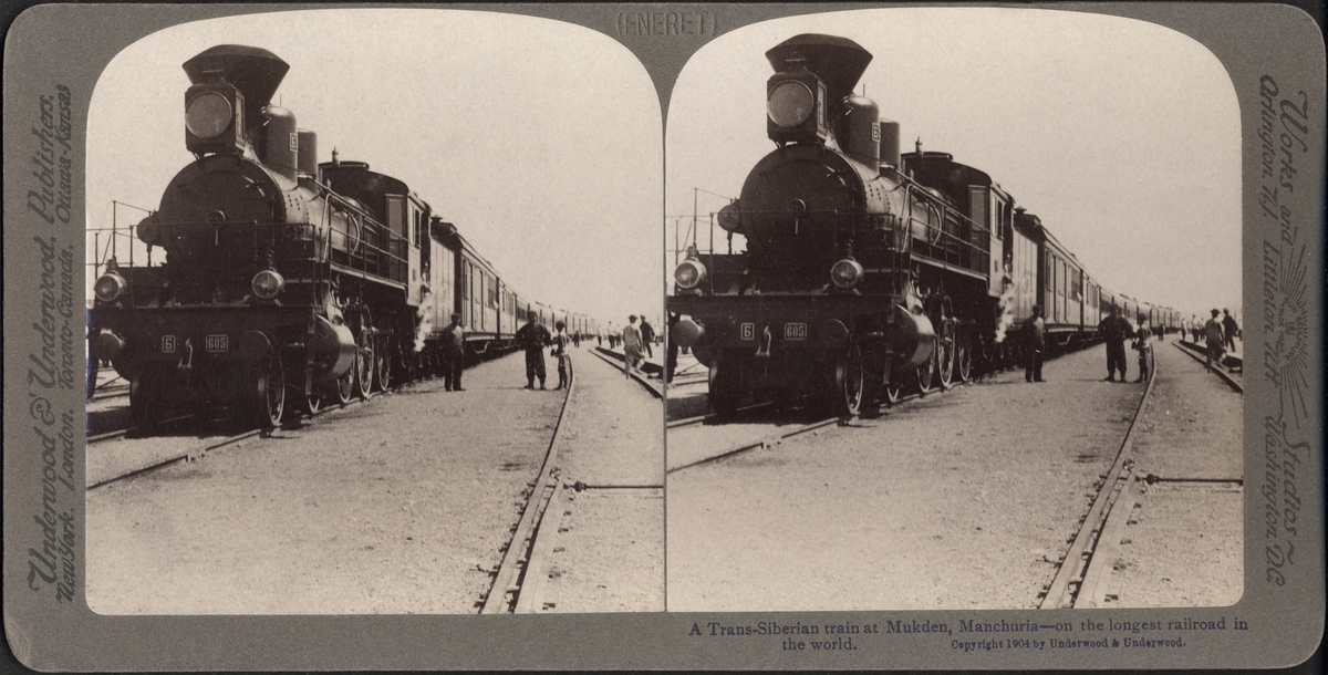 Stereobild av Transibiriska tågrt vid Mukden, Manchuria.