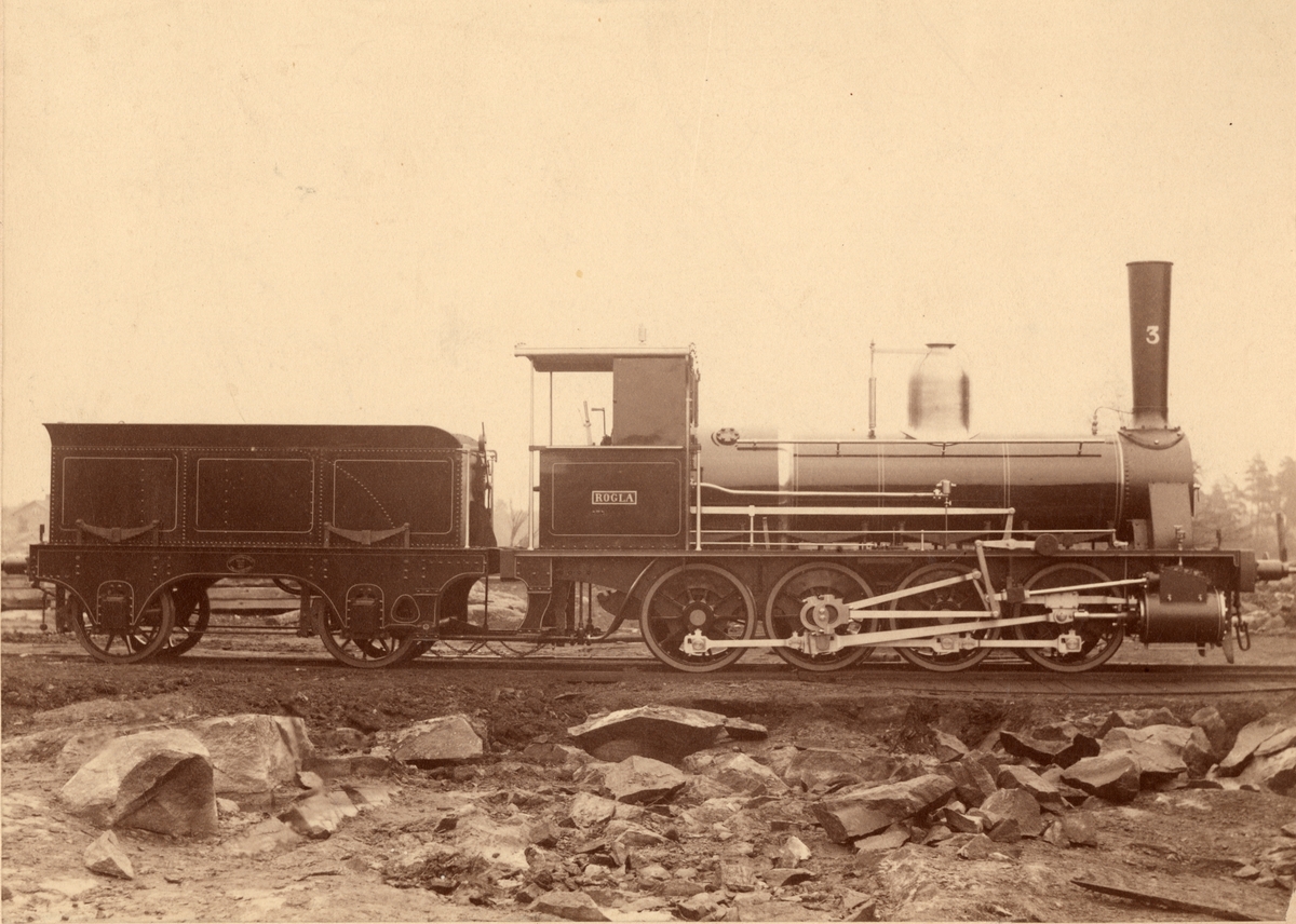 "Rögla". Lok nr. 3 vid Skåne - Hallands Jernväg (Järnväg). Tillverkat vid Nydqvist & Holm, 1883. No 181.