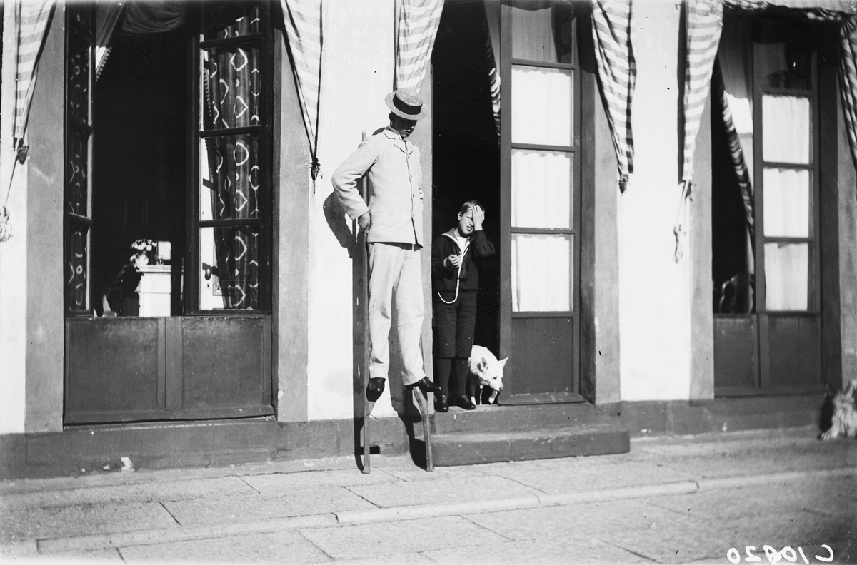 Drottning Victorias bilder.Det är Gustav (VI) Adolf som går på styltor. Den lille pojken som tittar ut genom dörren är prins Erik, Gustav Adolfs yngre bror. Troligen på Tullgarns slott.