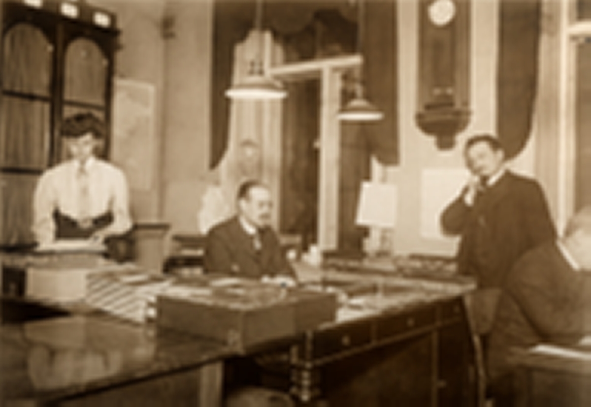 Fotografi ur album tillhörande Ester Holmberg, anställd vid Telegrafstyrelsens statistikavdelning 1902. Fotografierna troligen tagna 1907. Rv Rogberg vid skrivbordet.